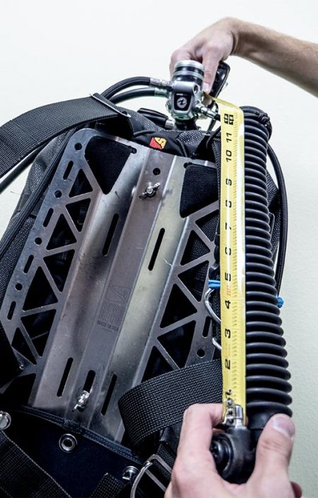 Measuring – Once you have mapped out where your hoses will be routed, measure the distance along the route from the first stage to where the hose should end – a buddy may make this process easier if you do it while wearing your equipment.  Flexible measuring tape will work best because this route is typically not a straight line.  Make sure the length allows for all desired functions of the hose and then purchase and install the appropriate hoses.