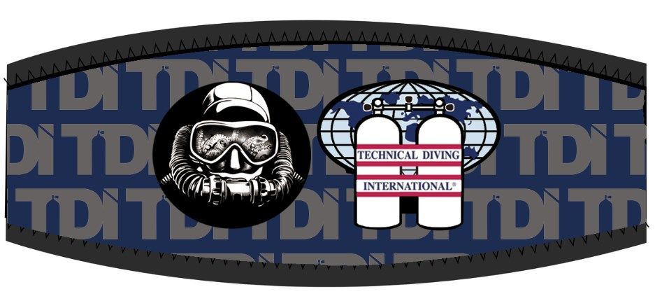 This item features the Technical Diving International agency logo on blue neoprene mask strap. Slip on, non Velcro design.